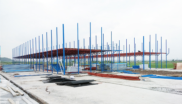 | 2、钢构架安装:板房承重骨架立柱安装、横梁安装、屋架安装。 |