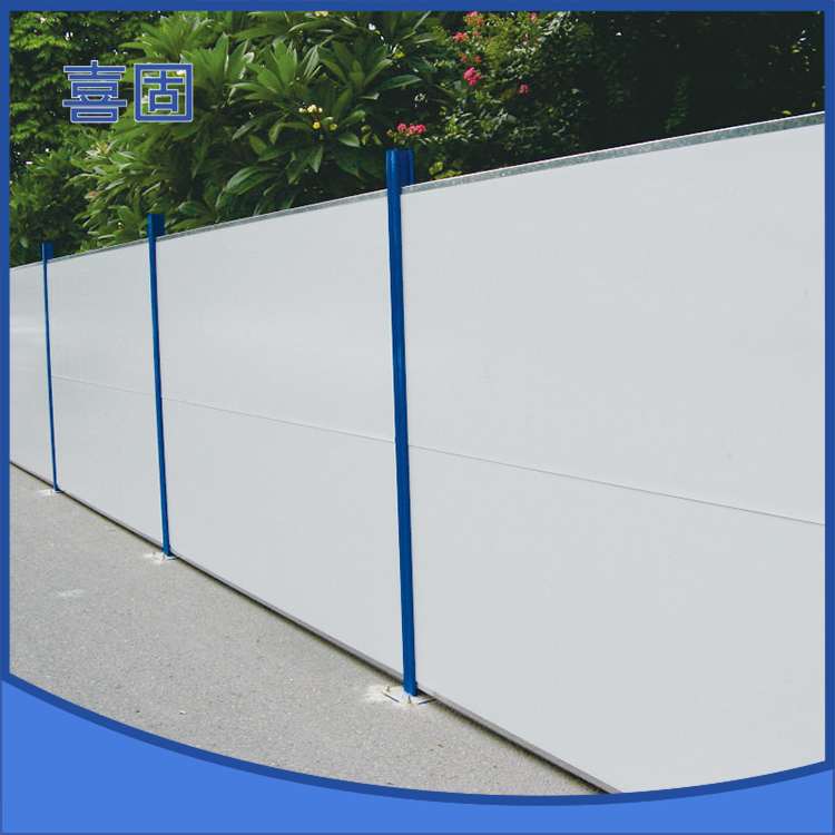 工地围挡由砖砌基座、立柱、(含套管)、上下横梁、PVC板组成,基座为5024高的墙,外贴文化石。本标段其余沿线选择一般蓝色彩钢板,运用厚度不小于,彩钢板选用60X4角钢做骨架,围挡背面选用30mm钢管做支撑,安定到既有路面上,围挡支腿部位焊接钢筋棍打眼固定在地面上,围挡的抗风性。